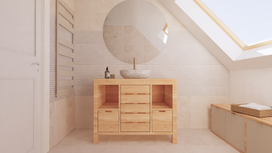 Nous avons également rénové deux salles de bains, chacune avec sa propre personnalité. L'une adopte un style industriel, avec des matériaux bruts et des éléments métalliques, tandis que l'autre se distingue par ses courbes douces, des tons neutres et lumineux qui invitent à la détente.